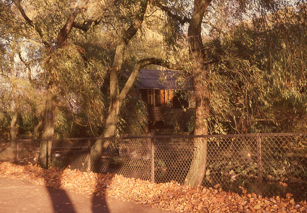 I förgrunden gångbana med staket och träd. Vid sidan en vattenkanal och bland träden anas en paviljong.