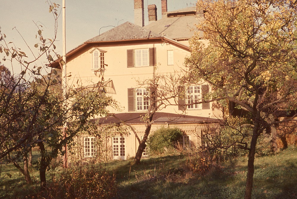 I förgrunden trädgård med träd. I bakgrunden villa med flera plan.