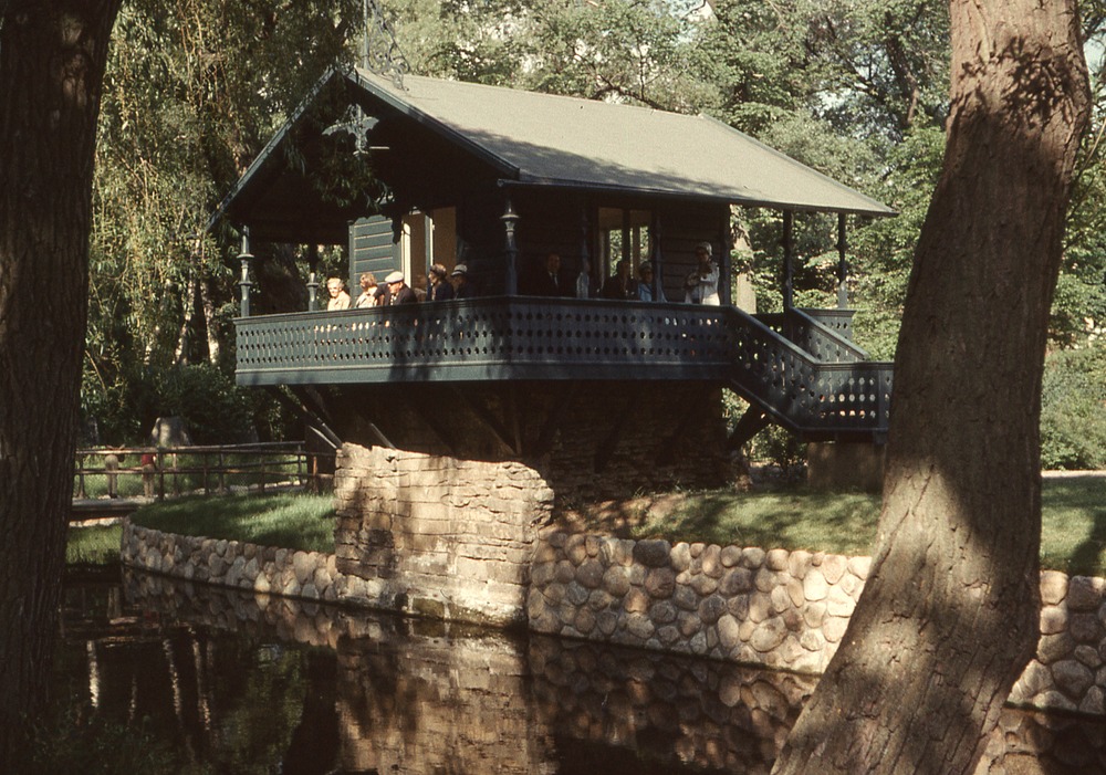 I förgrunden damm med murad sida och med en bro. Mitt i bild en paviljong med veranda. Allt omges av träd