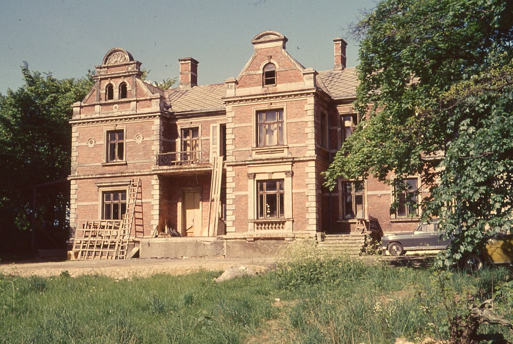 Bilden föreställer en villa omgiven av träd. I förgrunden en åker och vid huset står en stege. Huset verkar vara under reparation.