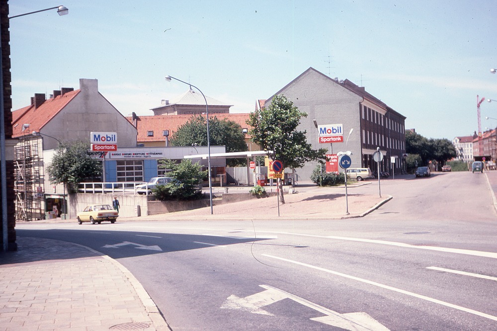 I förgrunden en gatukorsning. I hörnan ligger en bensinmack med namnet Mobil, spartank. I bakgrunden flervåningshus, ett med byggnadsställningar. På skylt står det avgas, broms, koppling, stötdämpare medan du väntar, lågpris.