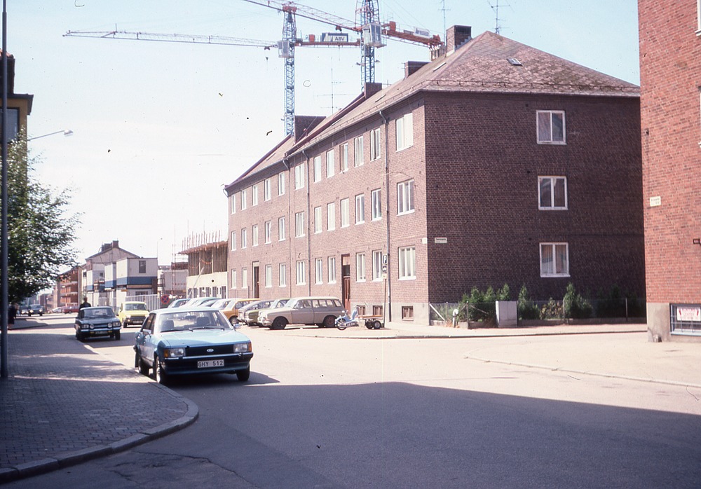 I förgrunden gatukorsning. Till höger treplanshus, bostadhus och framför det parkerade bilar. I bakgrunden byggarbetsplats med lyftkran och byggbodar.