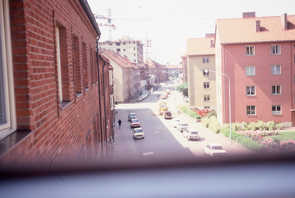 Mitt i bild gata med parkerade bilar. Till vänster och höger flervånings bostadshus. I bakgrunden ett hus med byggnadsställningar
