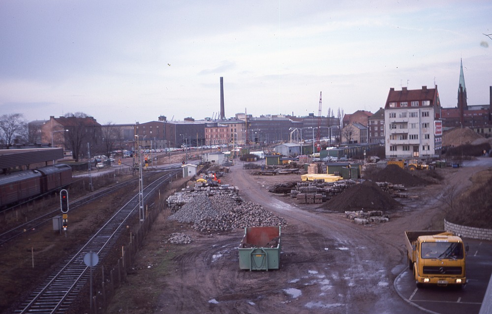 I förgrunden byggarbetsplats med tillfällig väg, lastbil, högar med material, container, byggbodar. Till vänster järnvägsspår och bakom dem en stor parkeringsplats med bilar samt byggnader troligen bostäder och industri