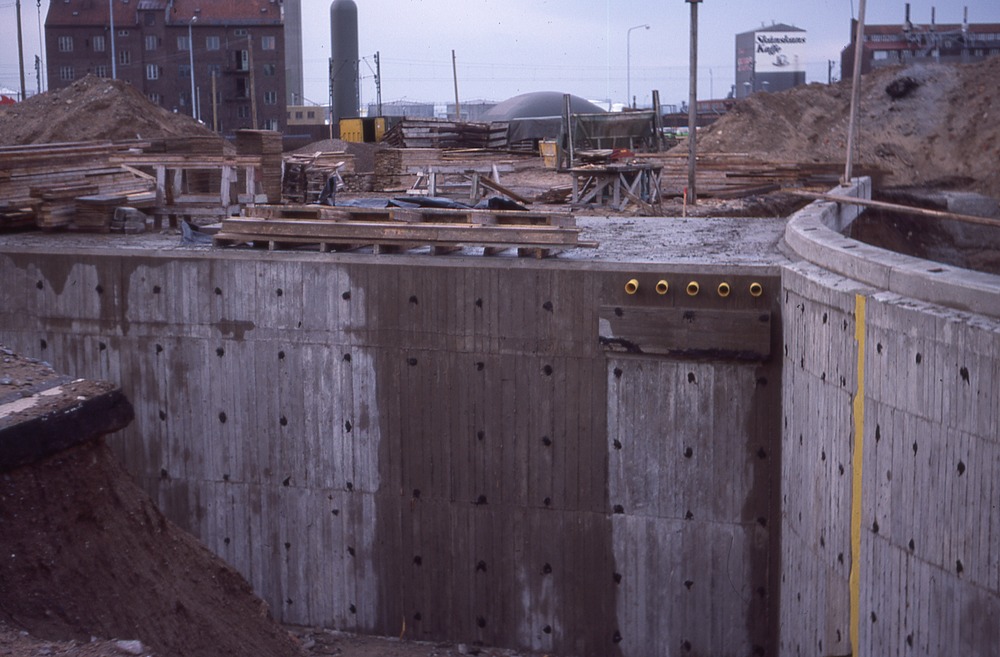 I förgrunden öppen grop med betonggjutna sidor. Uppe på marken olika byggnadsmaterial. I bakgrunden byggnader. På en byggnad står det Skånskans kaffe (?)