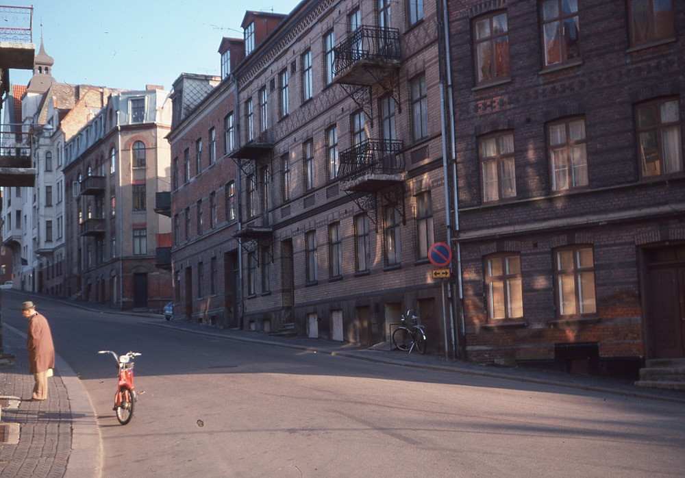 I förgrunden gata. I bakgrunden tre- till femvåningsbyggnad. En herre står på trottoaren och två parkerade cyklar.