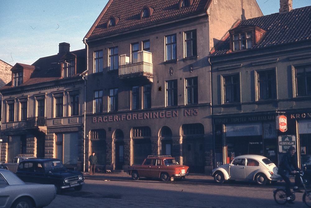 I förgrunden gata med parkerade bilar. I bakgrunden två- och trevåningshus, bostadshus med butik i bottenplanet. På huset står det Bageriföreningen no 3.