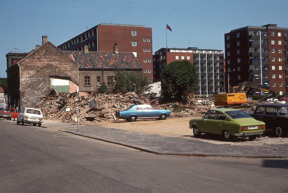 I förgrunden gata, där bakom öppen yta med parkerade bilar. Mitt i bild resterna efter rivet hus. I bakgrunden nybyggda flervåningshus, bostadshus.