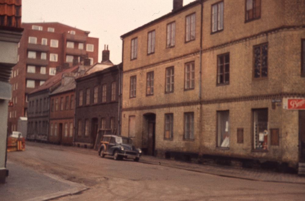 I förgrunden gata. I bakgrunden tre- och tvåvåningshus