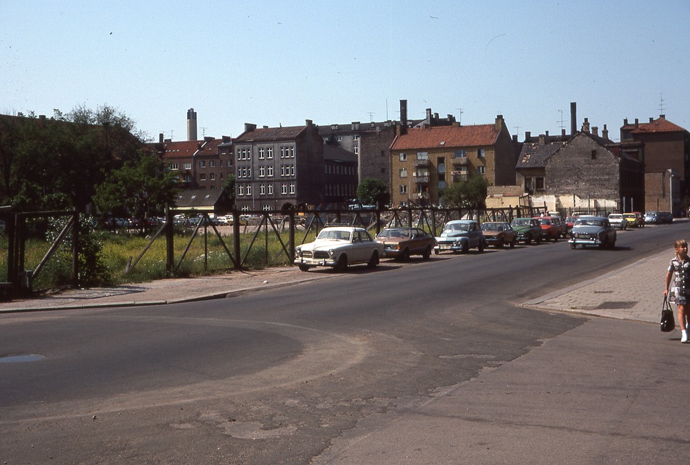 I förgrunden gatukorsning, och gata med parkerade bilar. Till vänster inhägnad ödetomt. I bakgrunden flervåningshus, bostadshus.