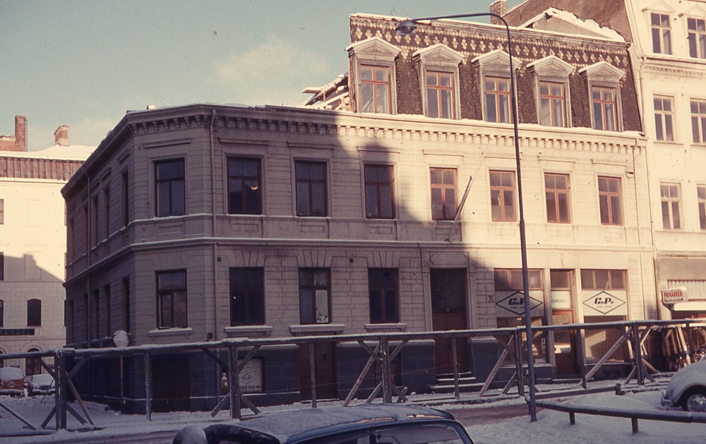 I förgrunden gata och parkering med snö. I bakgrunden flervåningshus, bostadshus. Runt huset någon form av staket. På huset står det GePe, verkstad.