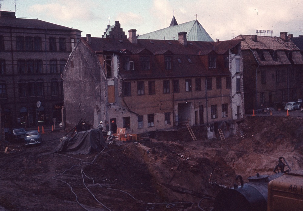 I förgrunden stor yta med grusgropar. I bakgrunden flervåningshus, bostadshus