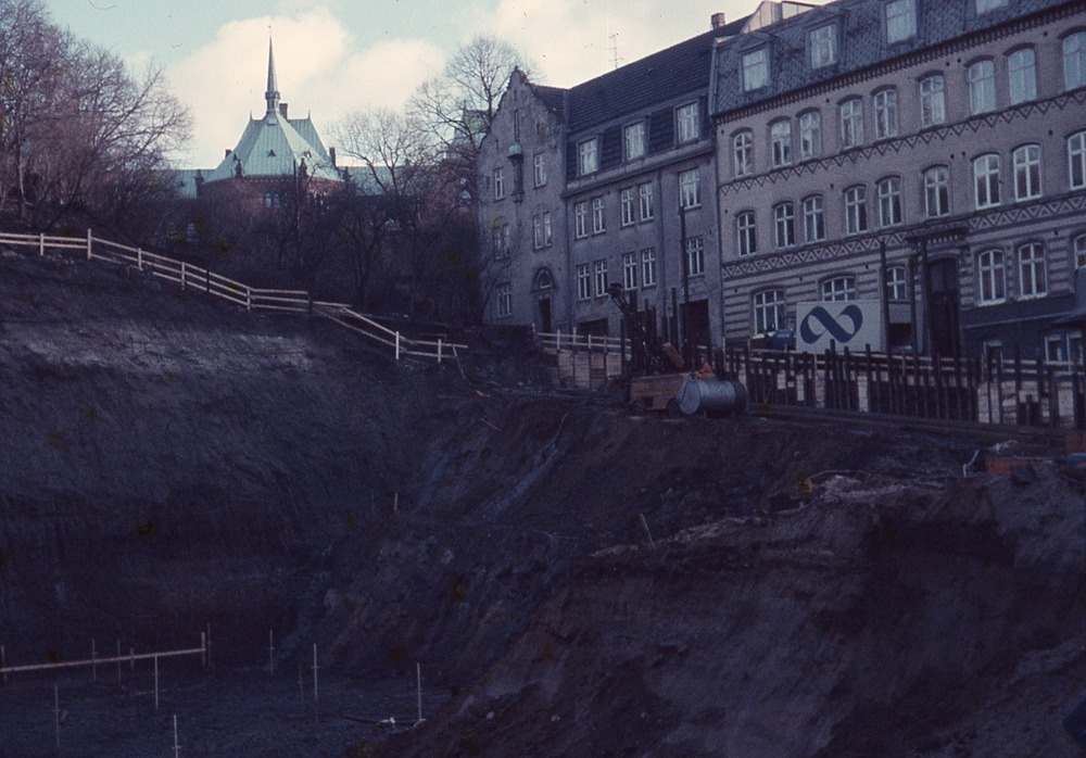 I förgrunden en utgrävd slänt med ställning i. I bakgrunden staket och buskar samt flervåningshus. Bostadshus.