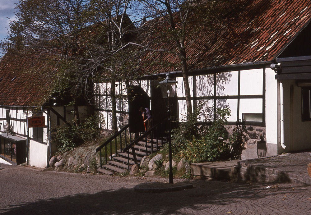 I förgrunden torg. I bakgrunden korsvirkeshus med yttertrappa