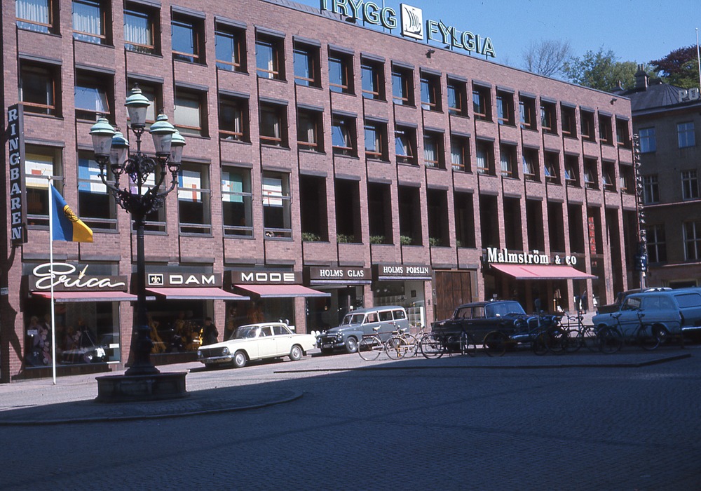 I förgrunden torg med lyktstolpe. I bakgrunden flervåningshus med butiker med markiser i bottenplanet. Framför huset stadsgata med parkerade bilar. På skyltar står det Ringbaren, Malmström & co, Erica dam mode, Trygg fylgia samt Holms glas, Holms porslin.