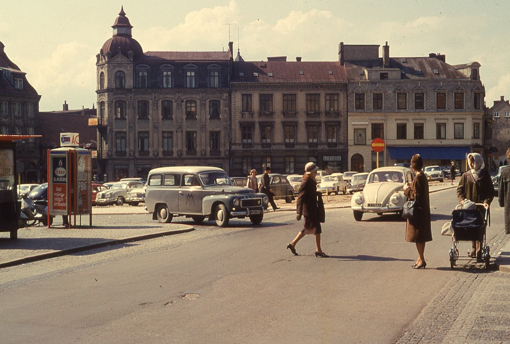 I förgrunden stadsgata med bilar och flanerande människor. Mitt i bild parkering med bilar. I bakgrunden flervåningshus. Bostadshus och affär. På reklampelare står det Esso gasol, det mångsidiga bränslet.