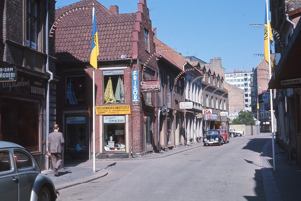 Mitt i bild gata. På bägge sidor byggnader, flervåningshus, med affärer i gatuplanet. På skyltar står det Herr o dam skrädderi, Xgårdens varuhus, Drangels sängkläder, Sköldenborgsinstitutet, försäljning av handikapparbeten, Ålgränden 5, Frisör, Mimosa blommor, Kulla boden, ICA, AGA radio tv, Dux.