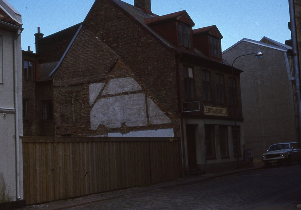 I förgrunden stadsgata. I bakgrunden plank och tvåvåningshus med hotell i gatuplanet. På en skylt står det Centralhotellet