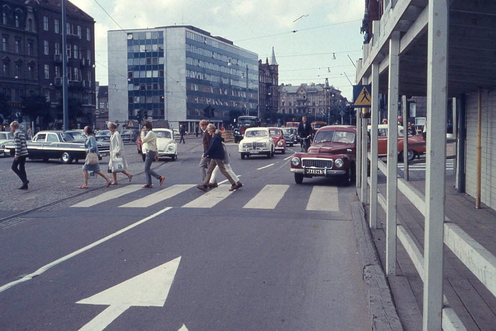 I förgrundenvägbana med övergångsställe med gångtrafikanter. I bakgrunden bilar och byggnader bland annat stadshuset