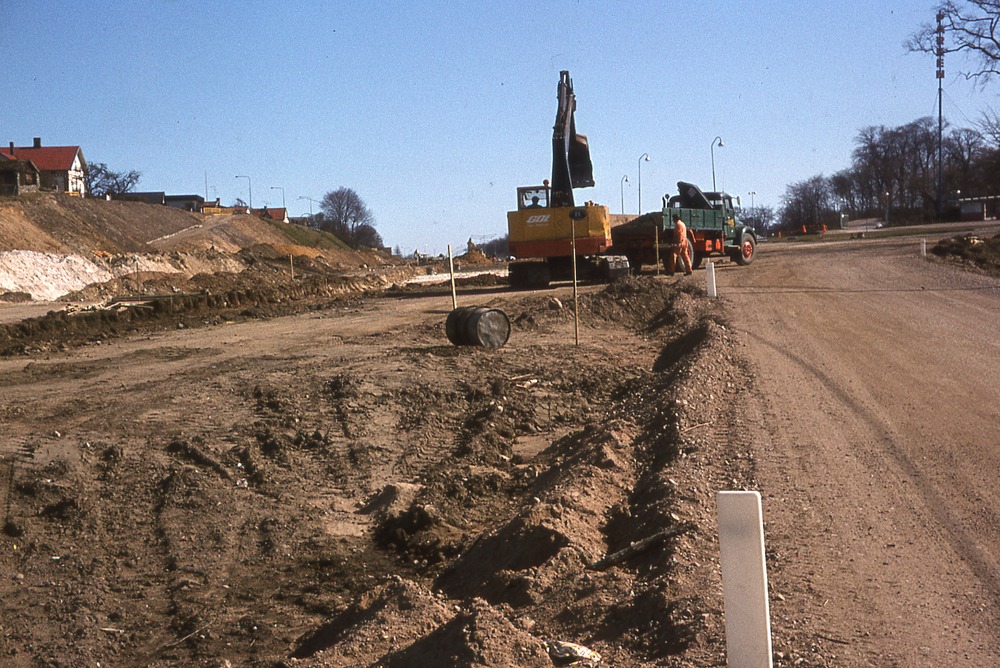 I förgrunden väg under uppbyggnad. I bakgrunden grävmaskin och lastbil