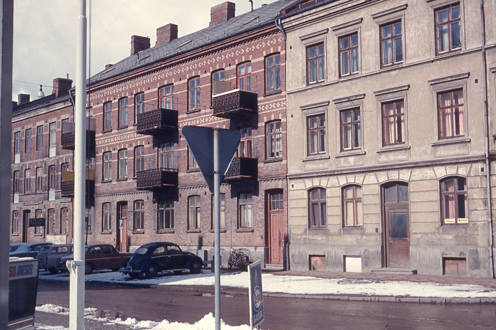 I förgrunden stadsgata i bakgrunden trevåningshus, bostadshus och framför parkerade bilar. Det är snö på marken.