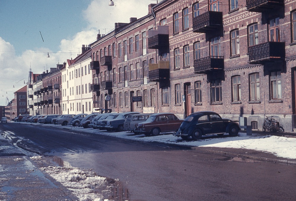 I förgrunden stadsgata. I bakgrunden trevåningshus med balkonger, bostadshus. Framför huset parkerade bilar. Snö på marken.