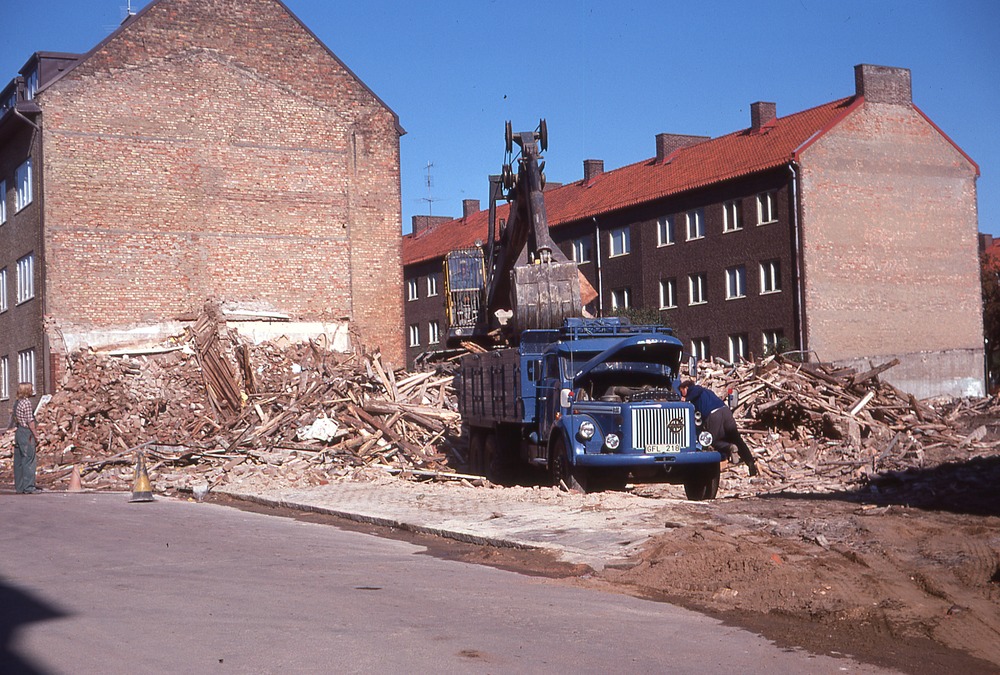 I förgrunden gata samt yta där hus rivits. Där står en lastbil troilgen med grävmaskin bakom. I bakgrunden trevåningshus med gavel och långsida, bostadshus.