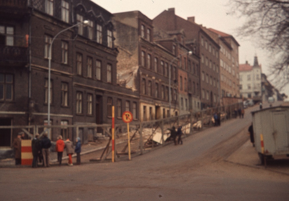 I förgrunden gatukorsning. På vänster sida tre- och fyravåningshus. I bottenplanet någon form av plank och byggnadsarbete