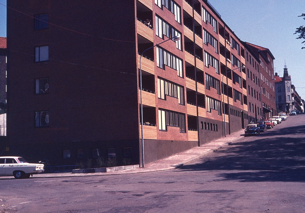 I förgrunden gatukorsning. I bbakgrunden femvåningshus med balkonger, bostadshus.