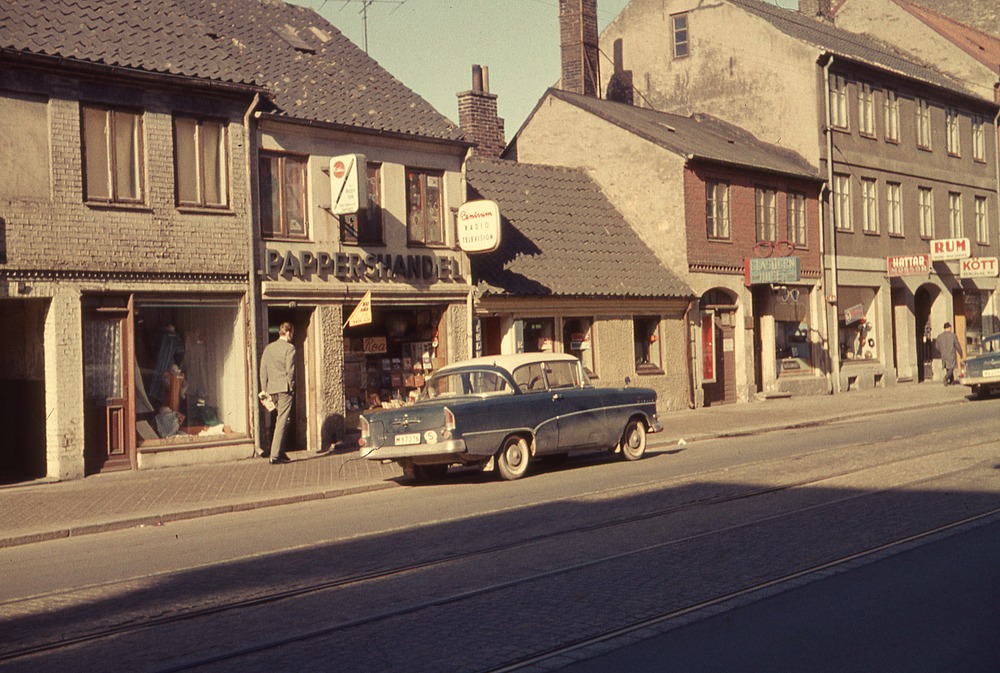 I förgrunden stadsgata. I bakgrunden en-, två- och treplanshus. Mitt i bild en parkerad bil. Affärer i bottenplanet. På en skylt står det pappershandel. "Centrum radio television", "Glasögonhuset", "Hattar Mössor", "Rum", "Kött".