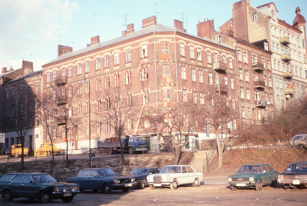 I förgrunden parkering med bilar och trappa upp till ett gatuplan. Där ligger ett fyra till flervåningshus med butik i källarplanet. Skylt med texten Möllans smörgåsbutik. En lastbil står intill huset och ett rör går upp till ett fönster.