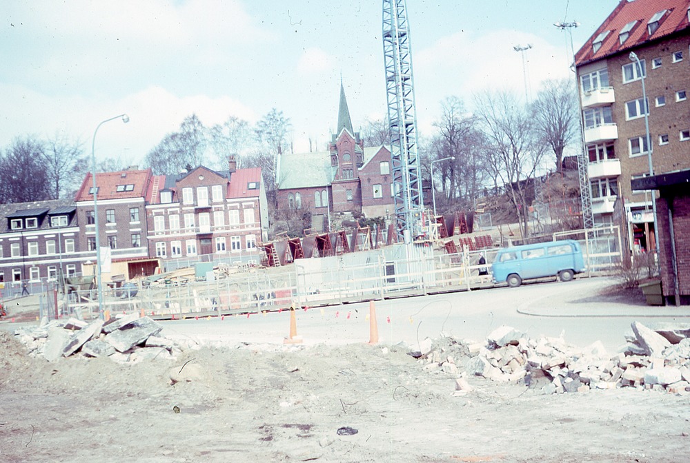 I förgrunden och mitt i bild en byggarbetsplats med markarbete och byggnadskonstruktion. Området är inhägnat. Där går en väg och på den står en minibuss. I bakgrunden flervåningshus och en villa.