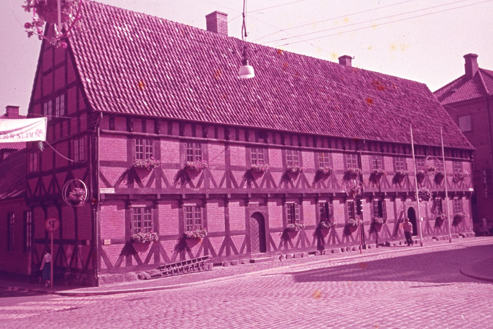 I förgrunden gata. I bakgrunden tvåvånings korsvirkeshus