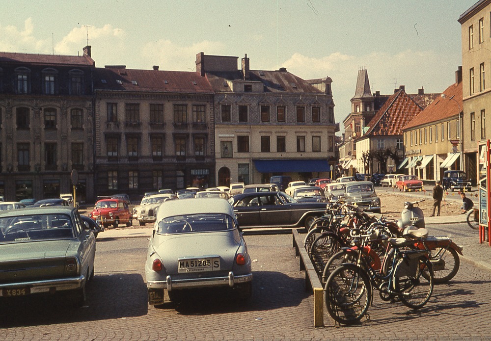 I förgrunden parkering med bilar och cyklar. I bakgrunden flervåningshus en del med affärer i bottenplanet