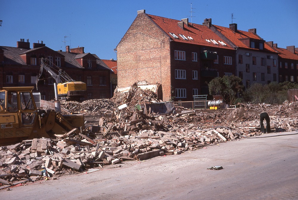 I förgrunden stadsgata. Där bakom yta med rivnimngsmaterial och två grävmaskiner. I bakgrunden flervåningshus, bostadshus