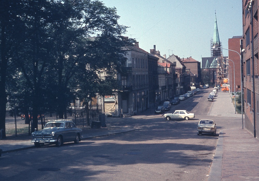 Mitt i bild en lång stadsgata omgiven av byggnader, till vänster träd. Bilar kör på gatan.