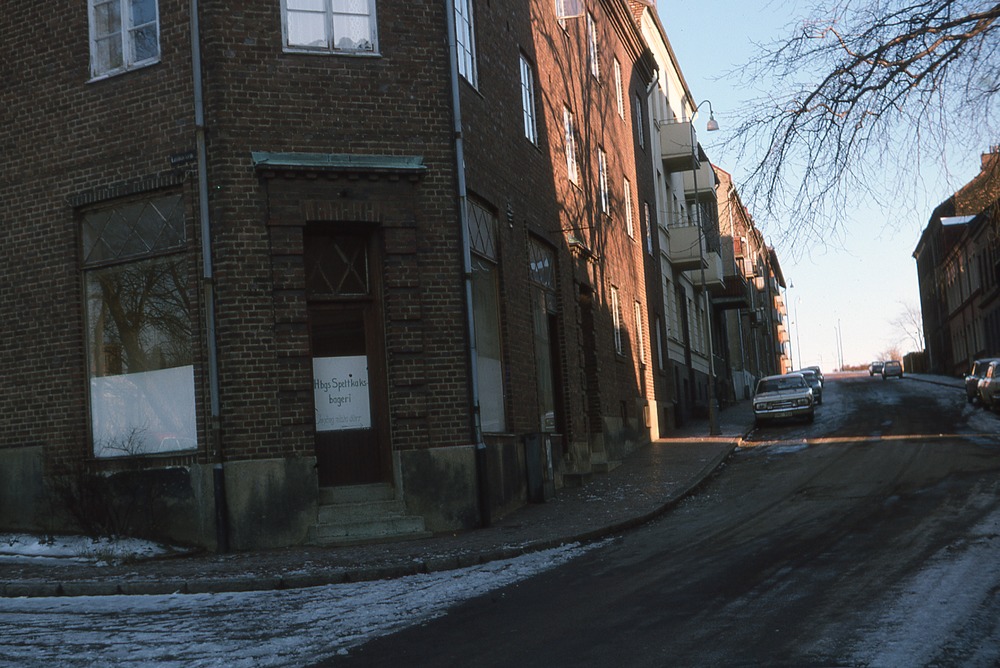 Gata med parkerade bilar och två- och trevånigshus på bägge siodr. På dörren på huset till vänster en skylt med texten Hbg Spettkaksbageri