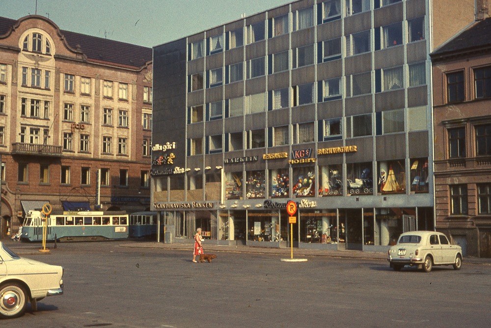 I förgrunden öppen yta, torg. Hus med sex våningar till höger med butiker i bottenplanet. I bakgrunden femvåningshus inrymmande folkets hus. Framför huset kör en spårvagn. På huset till höger skyltar Skandinaviska banken, Alla går i Rosanders skor (?), Märklin, Leksaker KGs hobby, Barnvagnar.