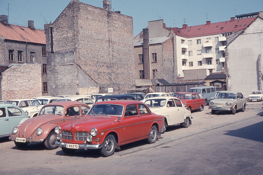 I förgrunden parkering med bilar. I bakgrunden byggnader och fasader med olika höjd
