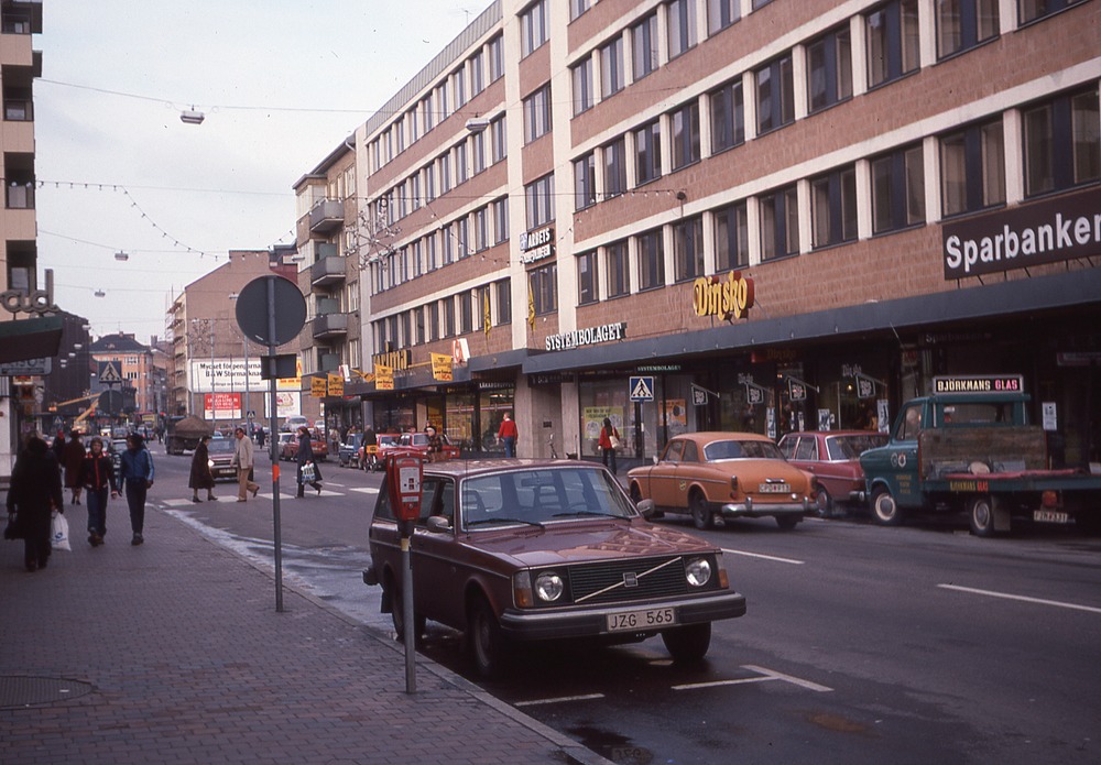 I förgrunden gata med parkerade bilar. På sidorna flervåningshus, bostads med butiker i bottenplanet. På skyltar står det Sparbanken och Din sko, Systembolaget, ICA, Mycket för pengarna B&W Stormarknad.