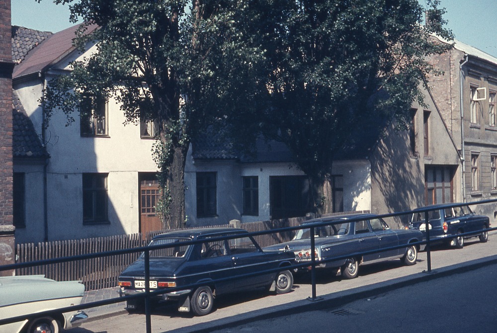 I förgrunden staket, där bakom gata med parkerade bilar. I bakgrunden tvåplanshus, bostadshus och framför fasaden ett träd.