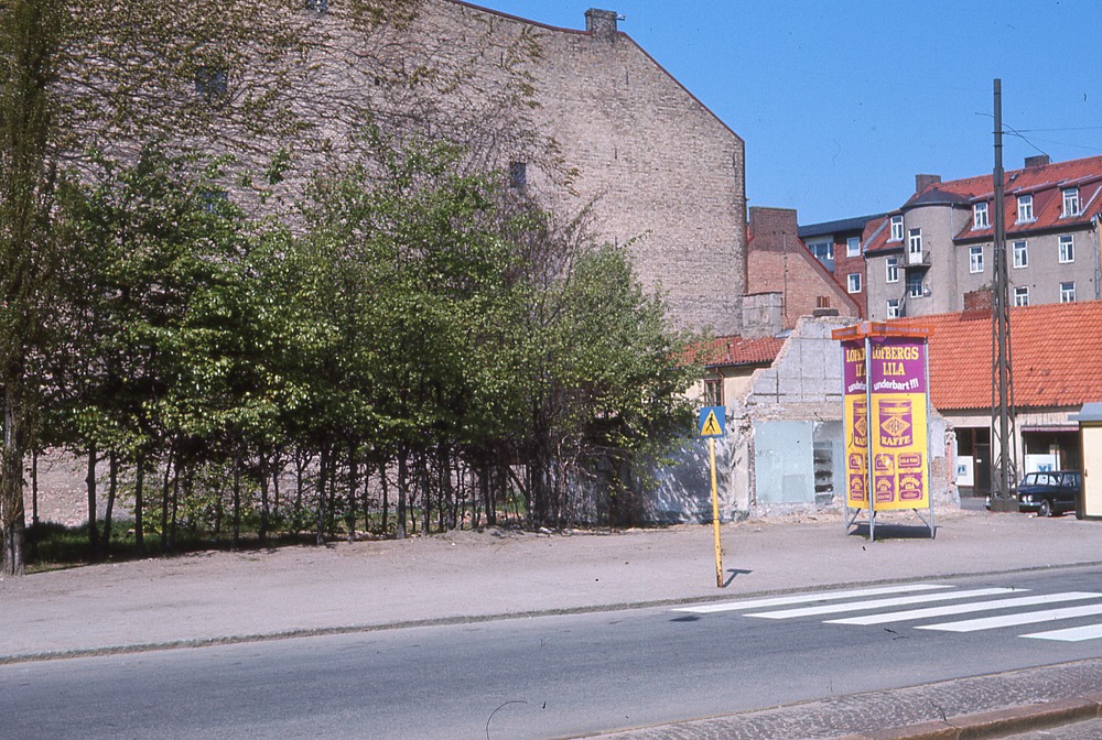 I förgrunden gata med övergångsställe. Där bakom gårdsplan med träd. Ytterligare bakom husfasad bostadshus. På gården står en reklampelare med texten Löfbergs lila underbar!!!, Kaffe
