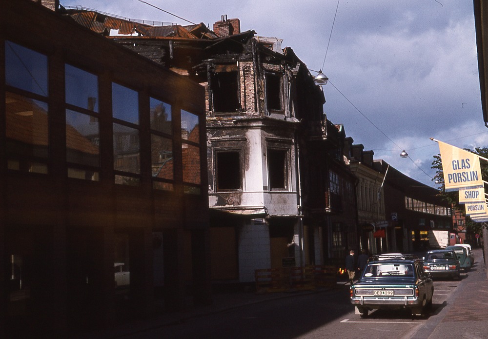 Till höger gata med bilar. Till vänster trevåningsbyggnader. Det ser ut som att det brunnit i huset mitt i bild. På gula vimplar står det glas, porslin, shop.