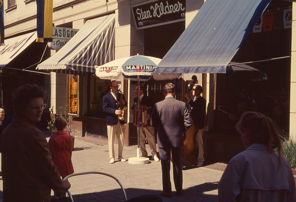 I förgrunden stadsgata med flanerande människor. I bakgrunden byggnad med affärer och markiser. På skyltar står det Glasögon, optiker, Sten Hildner och på ett parasoll Martini. Under parasollet musiker.