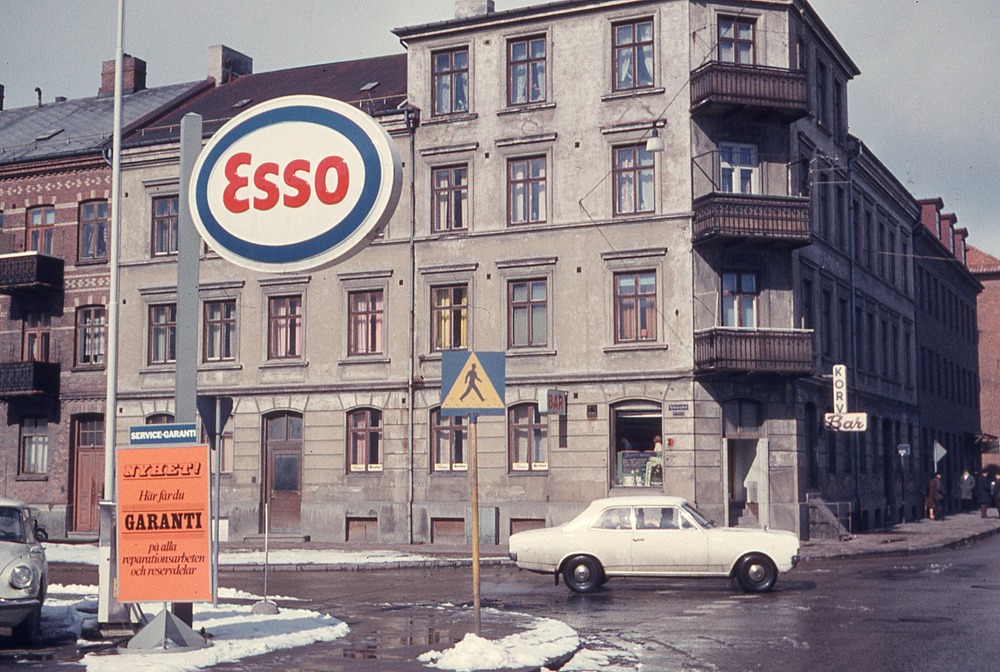 I förgrunden en gatukorsning med en bensinstations skylt "Esso". I bakgrunden tre- och fyravåningshus, bostadshus. På reklamskylt står det "Service-Garanti, Nyhet här får du Garanti på alla reparationsarbeten och reservdelar". På husets hörna en skylt med texten Korv bar.