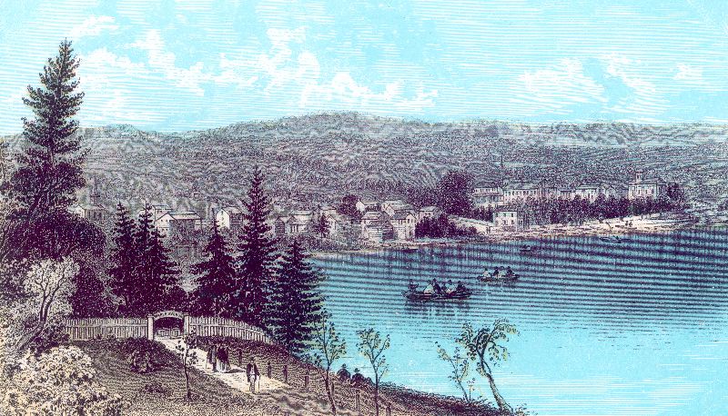 Ett avtryck av en målning. Caldwell-Lake George (from the grounds of Fort William Henry Hotel)