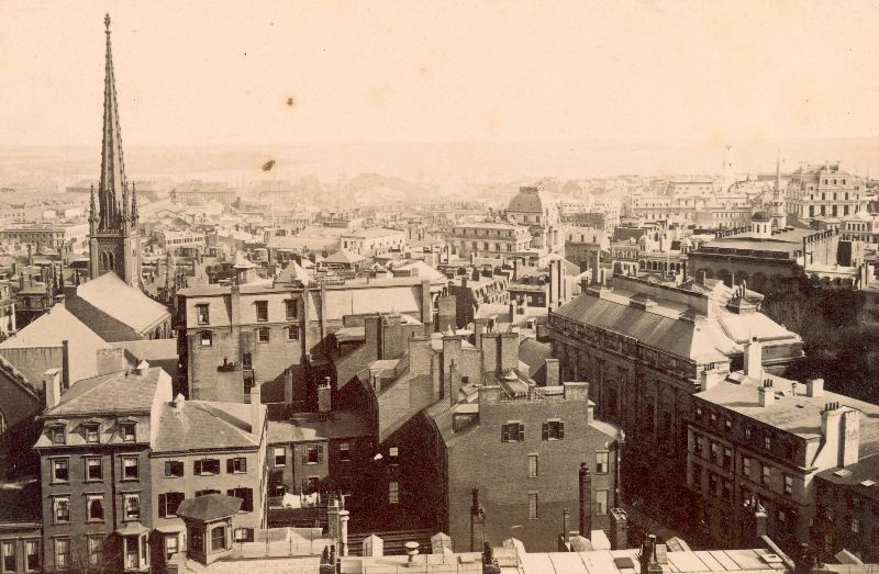Stadsvy. "panorama från State House-Boston hamn. (American Scenery, New England series)