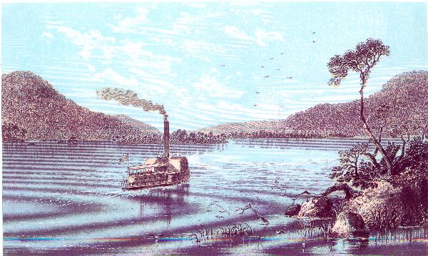 Hjulångare på Lake George. "Lake George-Entrance to the narrows from the south"