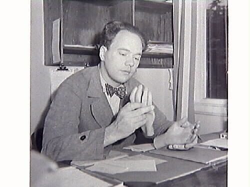 Bandagemästare A O Andersson vid Kustsanatoriet Apelviken, porträtterad i Hallands Nyheter 1950. Han står vid ett par gipsavgjutningar i form av torsos.