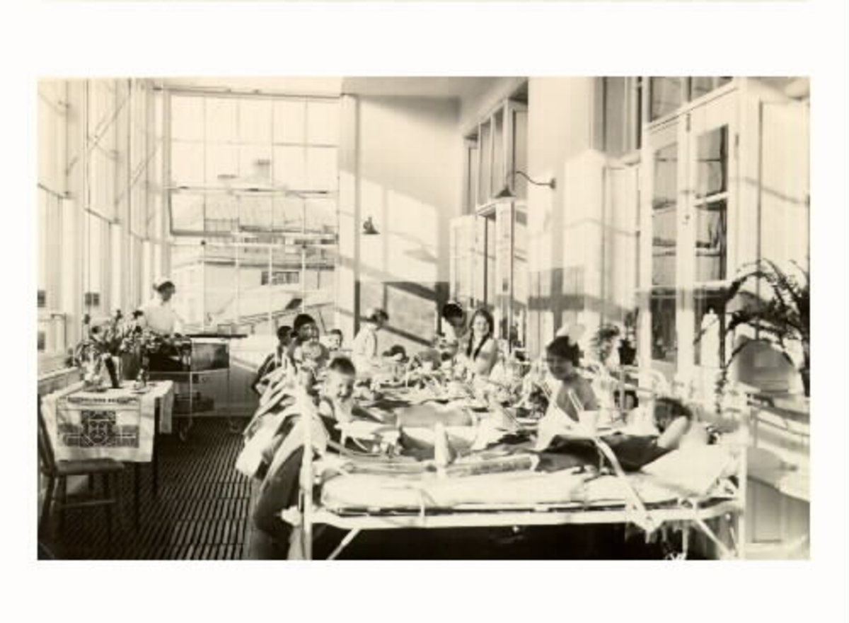 Interiör av solbalkong på Kustsanatoriet Apelviken under 1920-talet.